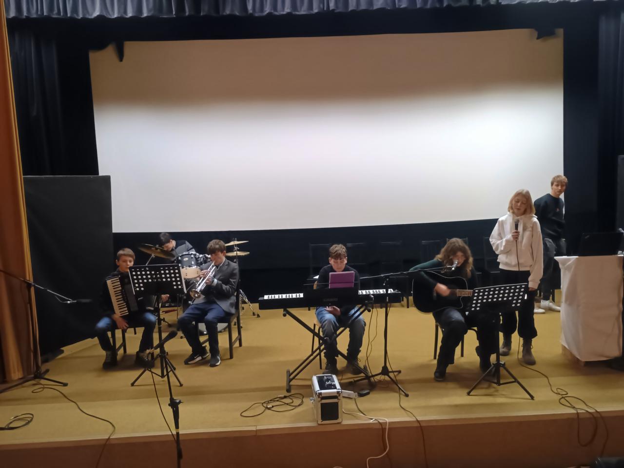 Na postu zpěvaček vystoupily Johana Machalová a Agáta Janči, která se zároveň doprovázela na kytaru. Za klávesy usedl Ondřej Pyták, paliček se chopil Vítek Vorel a celému vystoupení dodávali šťávu Dominik Schmeller s akordeonem a Antonio Hasal s trumpetou. Čas strávený zkoušením v hudebně se této sestavě opravdu vyplatil, protože předvedli píseň Tichá jako voda od skupiny Jelen v takové podobě, že by z nich měl zpěvák Jindra Polák určitě radost. Celou akci zakončil Vítek Vorel na klávesy skladbou F. Chopina Mazurka F dur. Doufáme, že nás hudební energie neopustí a uvidíme se i na dalších školních či mimoškolních akcích!!!