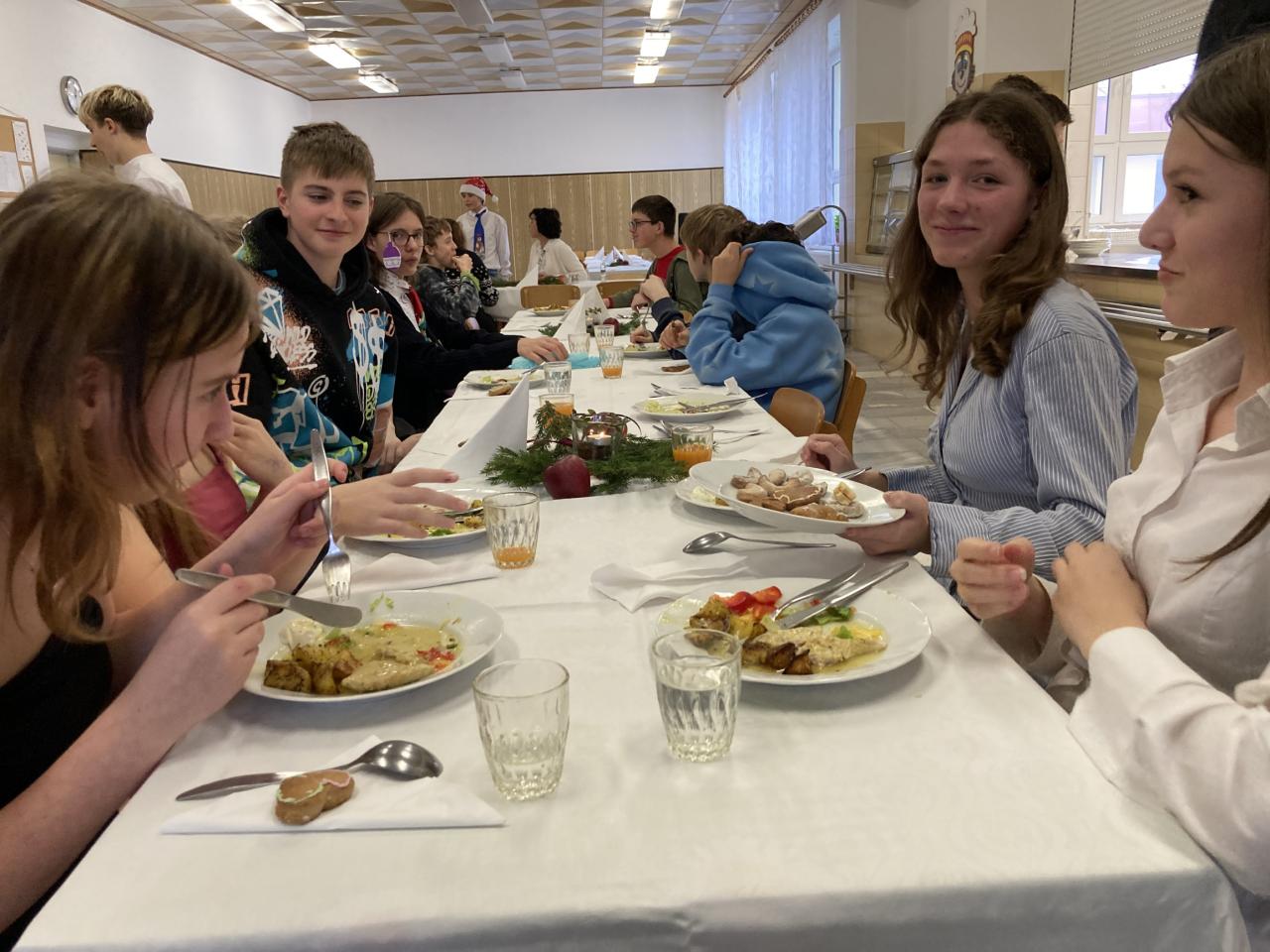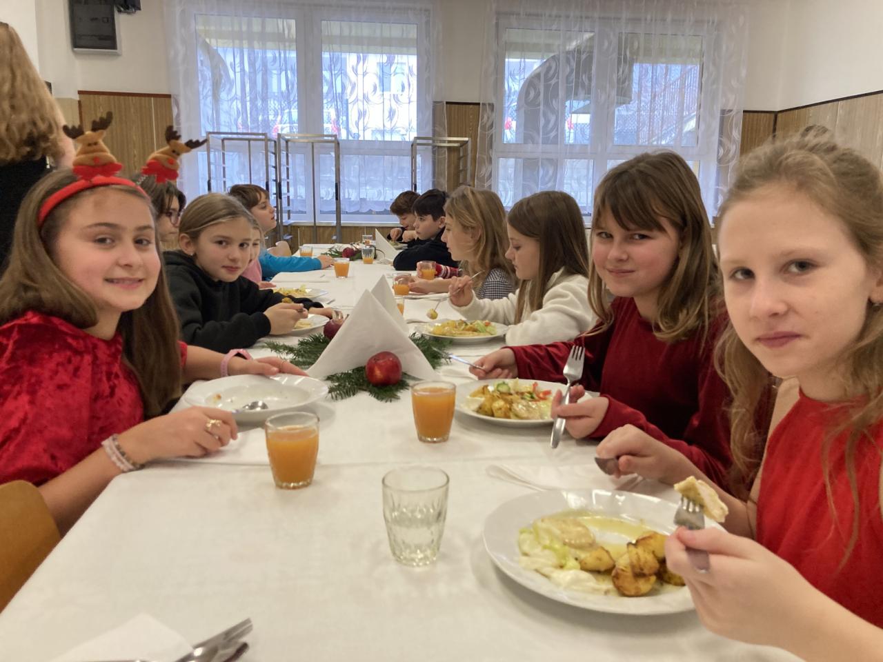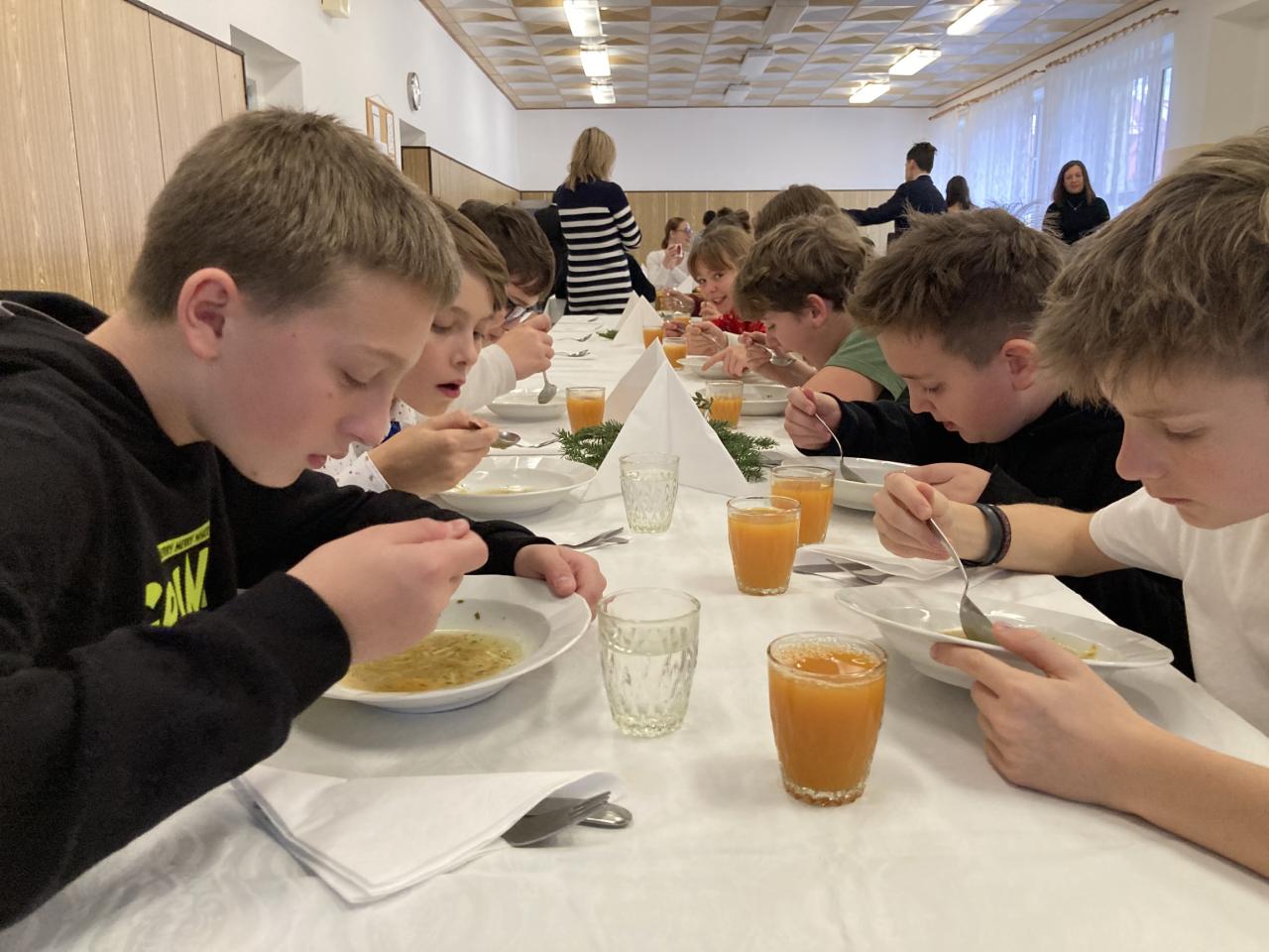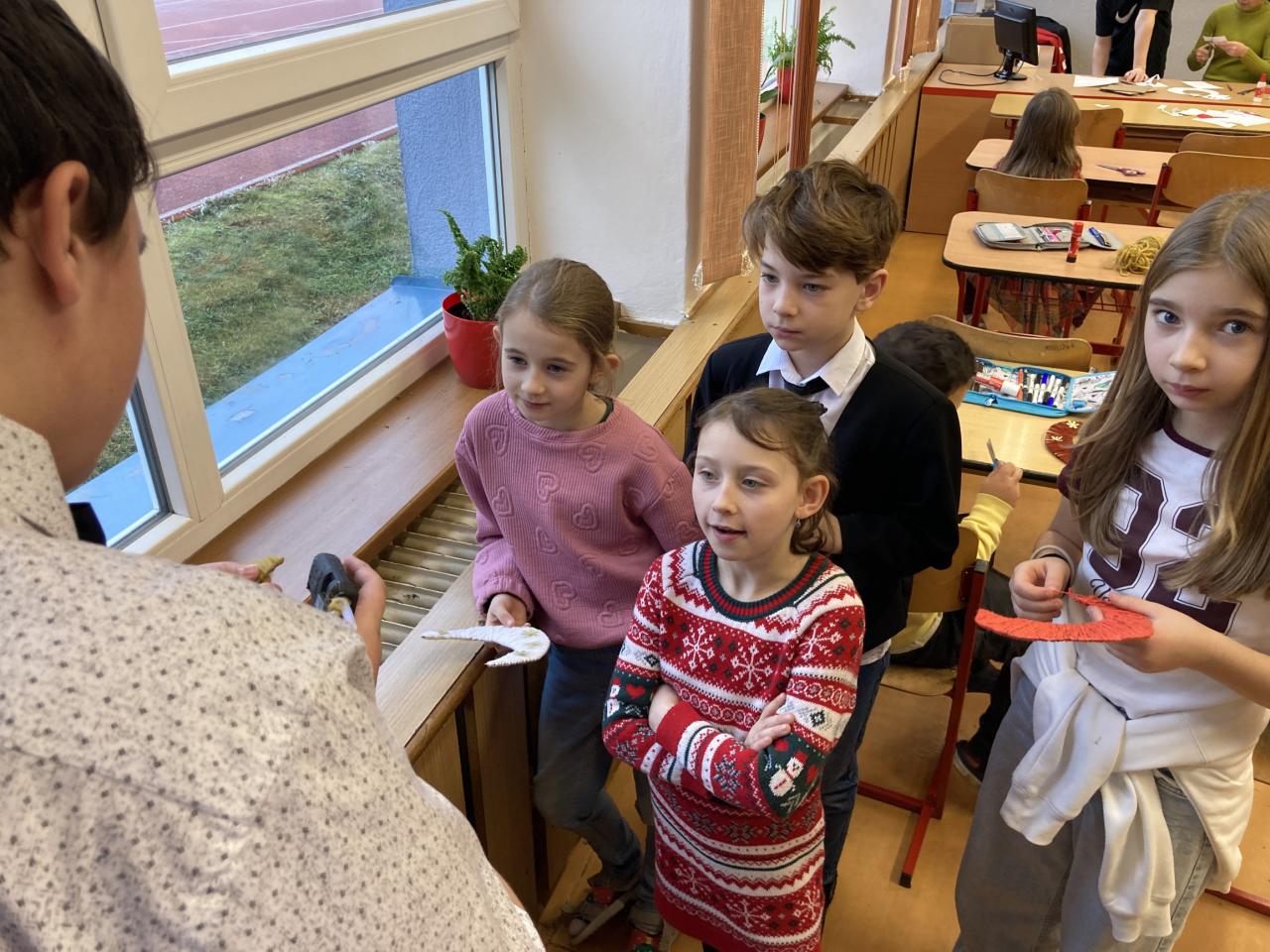 Na úvod nás vánočně naladil pěvecký sbor, po něm následovala vystoupení žáků druhého stupně a poslední píseň zazpívalo tradičně hudebně-učitelské těleso. První hodina společně stráveného času byla vystřídána vánočními dílničkami, na nichž žáci zhotovili drobný výrobek s vánoční tématikou. Nejstarší žáci si tak ocitli v roli pomocníků a asistentů. Další část předvánočního dne se odehrávaly jedinečné programy v každé třídě u stromečku. Celý den byl završen slavnostním obědem, u kterého obsluhovali žáci deváté třídy.